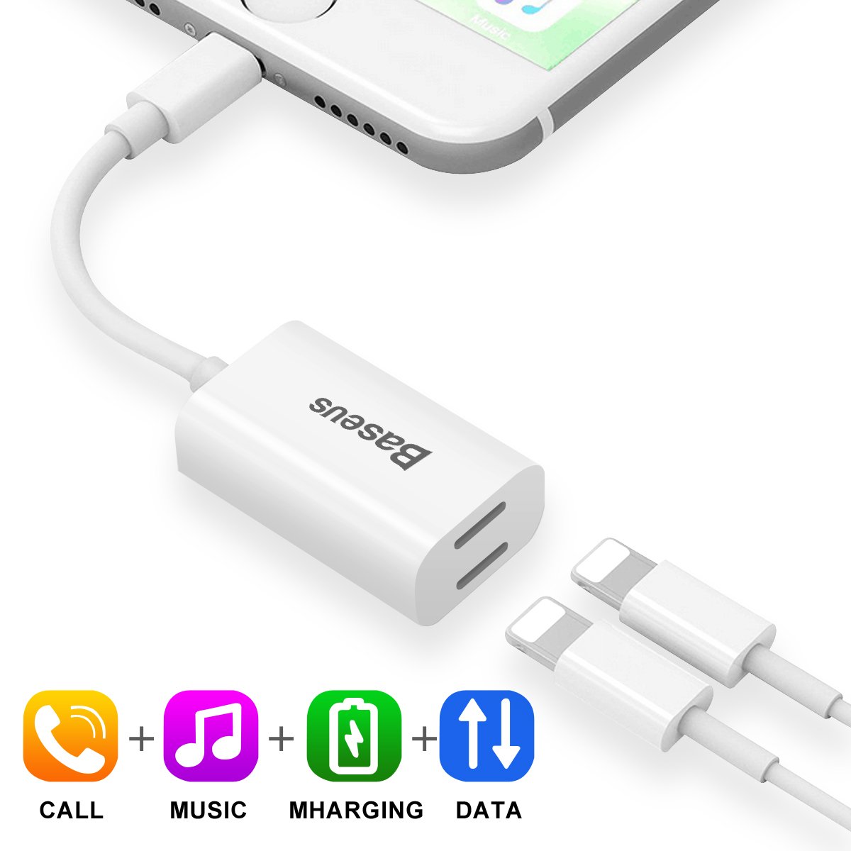 IPhone 7 plus Lightning a Doppio Adattatore IP Socket, Baseus Supporto Call & Ascolto Musica & Caricamento e Trasferimento Dati 4-in-1 2.1A Adattatore per il cavo di fulmini per IOS 10.3 (Bianco) descrizione