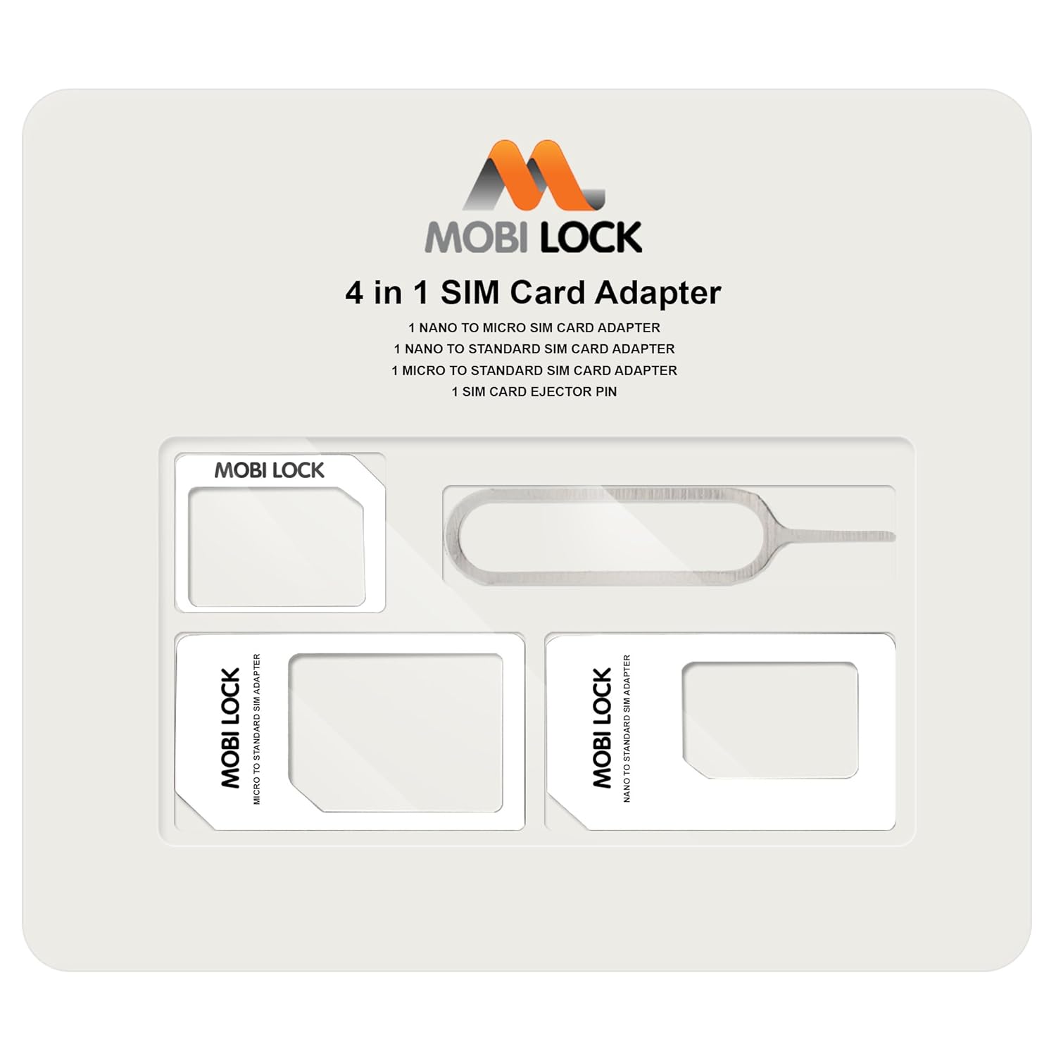 Il Kit Adattatore Mobi Lock per Nano Scheda Sim 4 in 1 (Nano / Micro / Standard) è la soluzione perfetta per chi cambia telefoni che richiedono tipi diversi di scheda Sim. Converte la tua Nano Scheda Sim in Micro Scheda SIM o Nano Sim in Scheda Sim Standard usando l'adattatore sim da nano a standard, e da Micro Scheda SIM a scheda SIM standard usando l'adattatore sim da micro a standard.